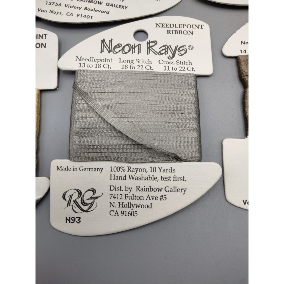 This lot features 19 neon rayon ribbons from Rainbow Gallery. Some are new and some are partials.