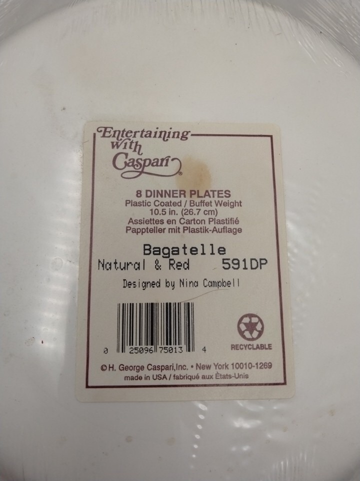 Caspari Plastic Coated Dinner Plates 10.5” 2 Packs Of 8 Sealed Bagetelle