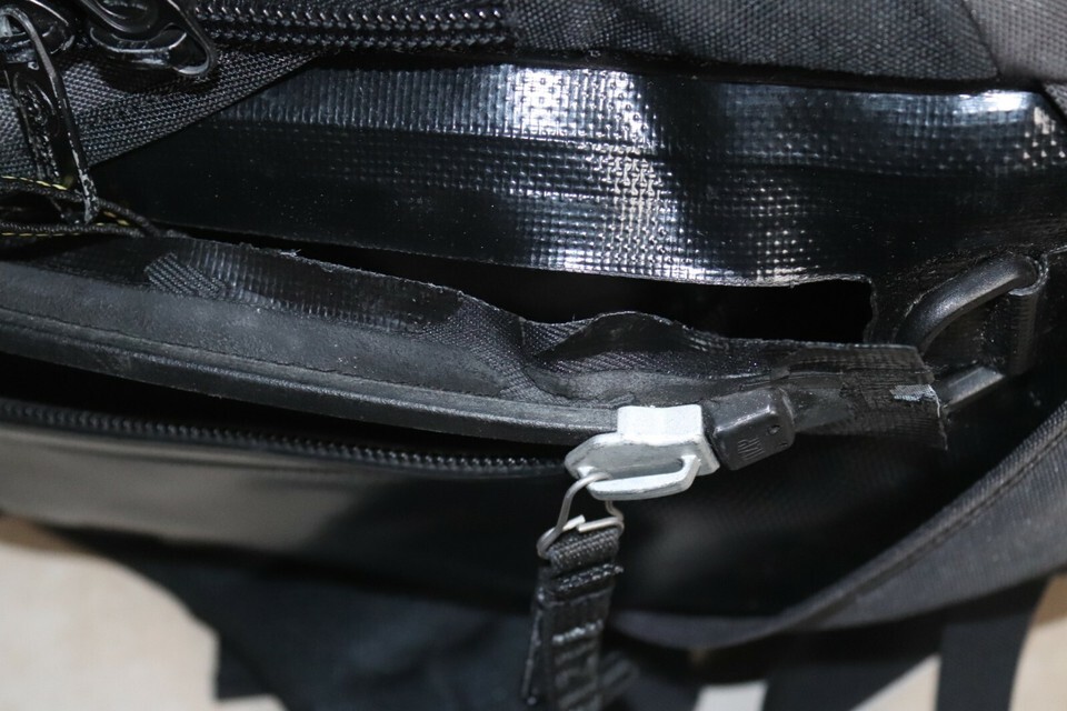 THIS IS SOLD AS PICTURED, THE MAIN ZIPPER IS TORN FOR ABOUT 6 INCHES IN ONE CORNER (PICTURED) ITS VERY HARD TO PULL BUT IT WORKS. ONLY BUY IT IF YOU ARE PREPARED TO SERVICE THE MAIN ZIPPER. THE REST OF THE BAG IS IN GREAT SHAPE. LOOK AT MY PICS FOR PROOF