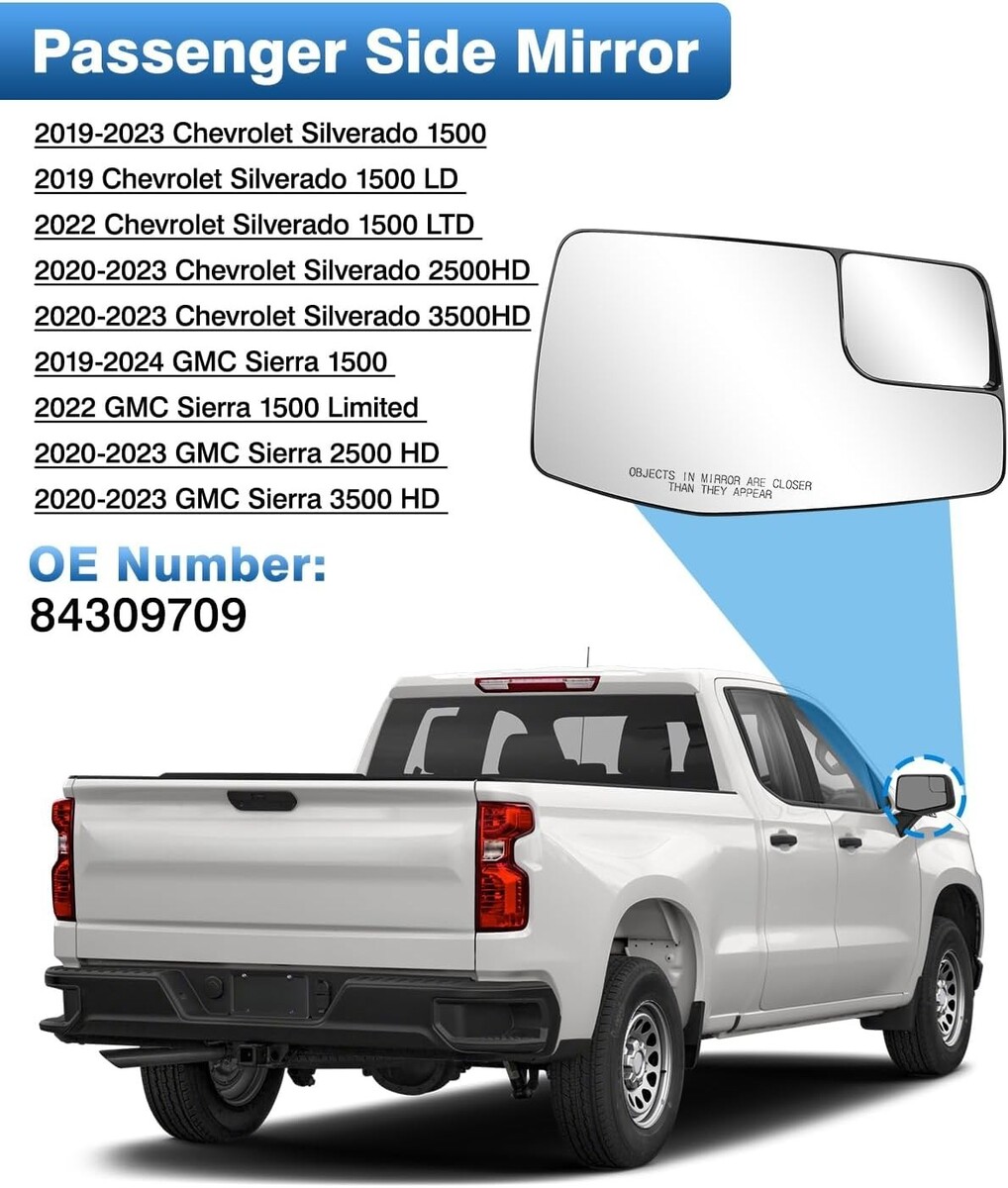 Direct replacement for GMC Sierra 1500 2019-2024, GMC Sierra 1500 Limited 2022, GMC Sierra 2500 HD 2020-2023, GMC Sierra 3500 HD 2020-2023, Chevrolet Silverado 1500 2019-2023, Chevrolet Silverado 1500 LD 2019, Chevrolet Silverado 1500 LTD 2022, Chevrolet Silverado 2500 HD 2020-2023, Chevrolet Silverado 3500 HD 2020-2023 passenger side mirrors. Replace OE part number: 84309709.