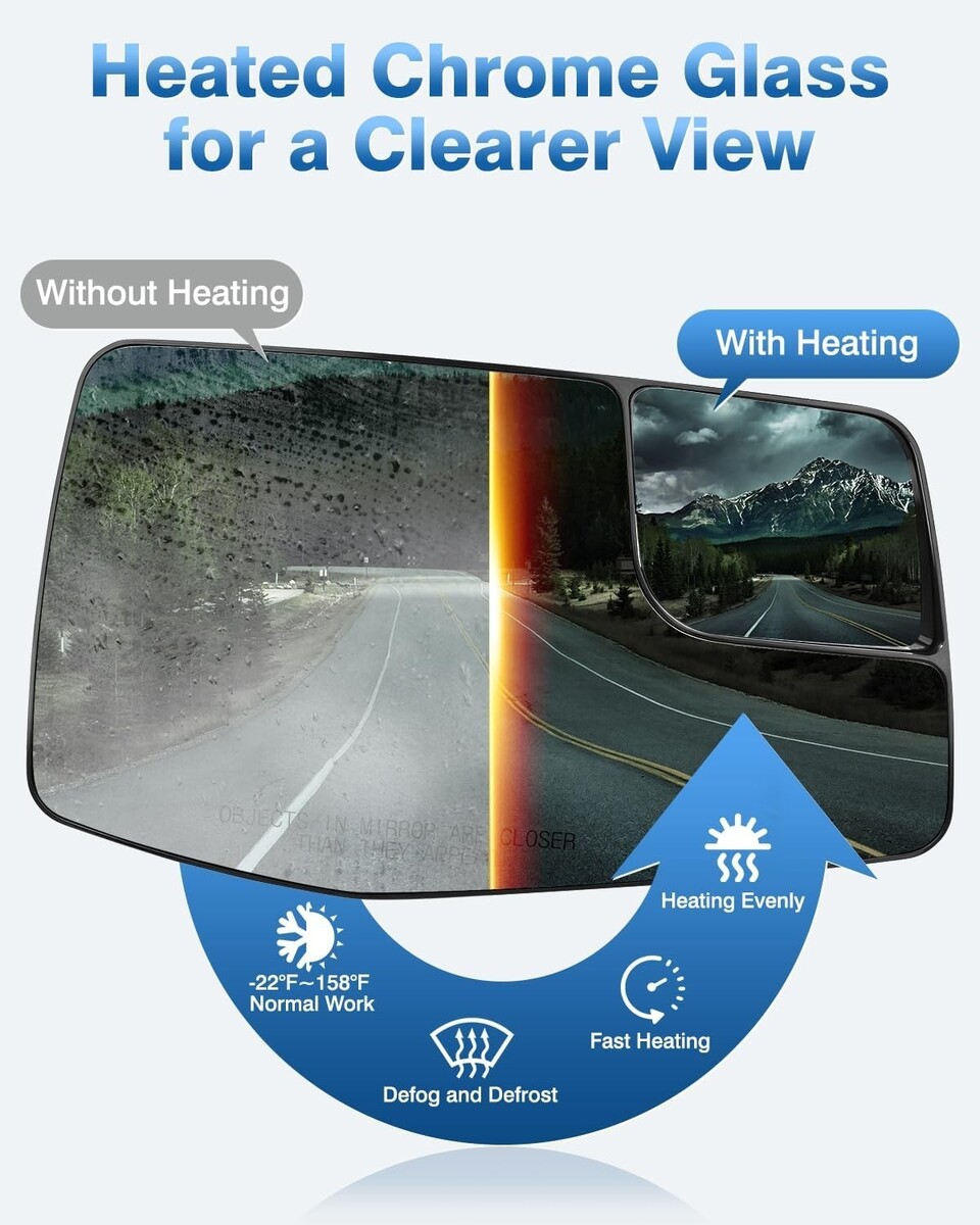 Equipped with a heated design to eliminate fog and melt ice and snow from the inside out. Ideal for maintaining clear visibility in all weather conditions. Please note, this mirror does not include an auto-dimming and blind spot function.