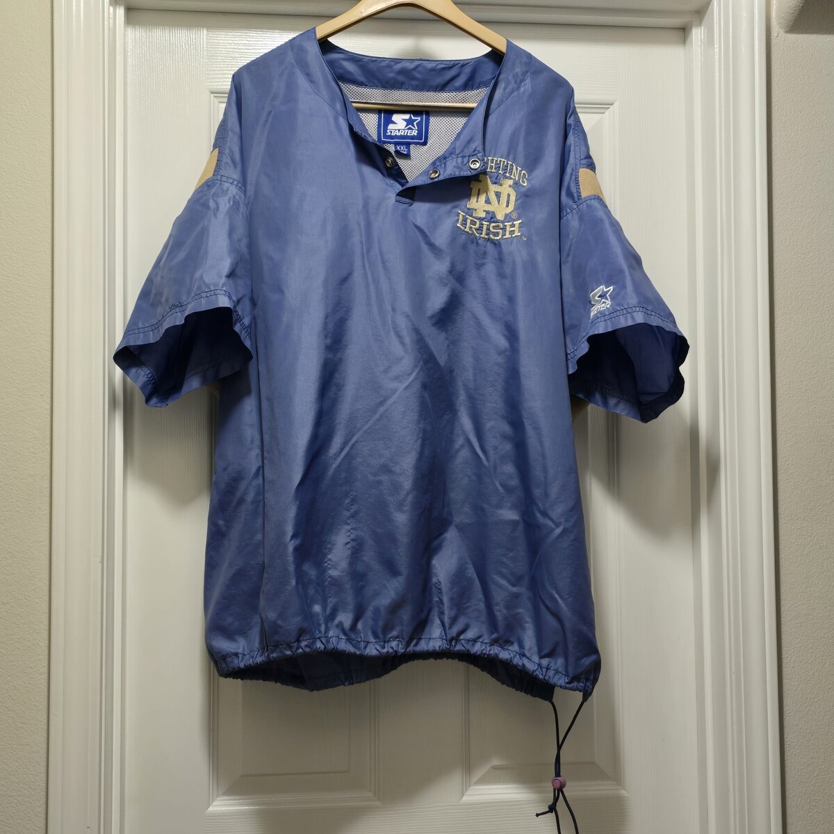 Excellent Condition Vintage Starter Notre Dame Fighting Irish Short Sleeve Lightweight Mesh lined Pullover Windbreaker Jacket NCAA Men?s Size 2X. Actual measurements: 56" chest, 30" length.
