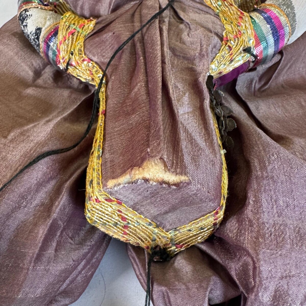 Condition: Good vintage condition with one notable flaw ? the fabric at the back of the head covering is worn through (see photo), no stains, tears, holes, or damage otherwise. Colors remain bright and intact.