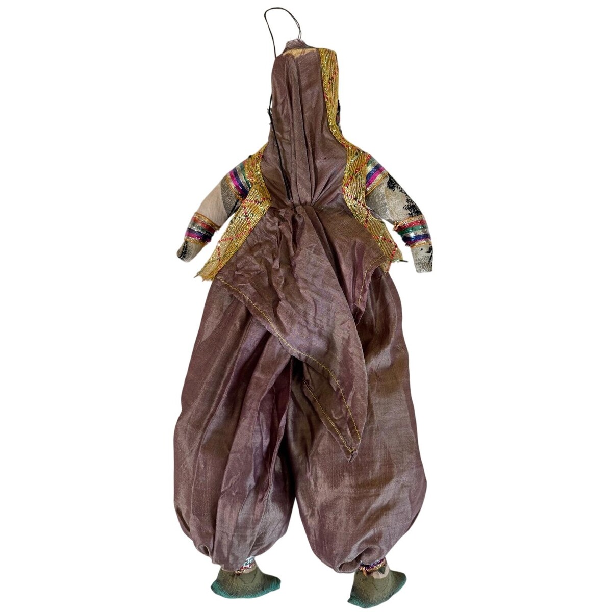 Handcrafted Rajasthani folk doll, inspired by the traditional Kathputli puppets of India. Features a painted papier-mache head with jeweled adornments, colorful embroidered garments, and metallic trim. Includes the original hanging loop for wall or display use.