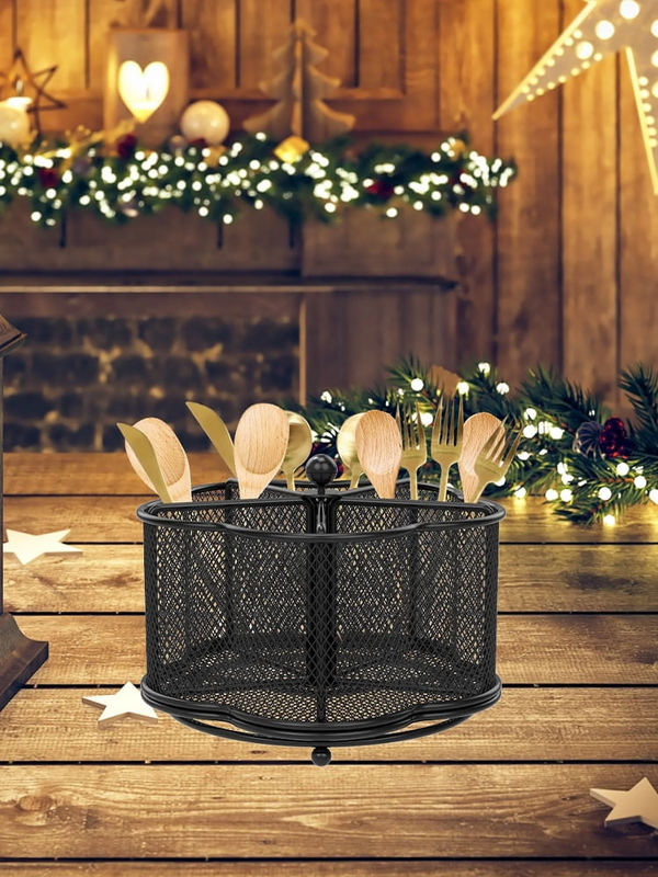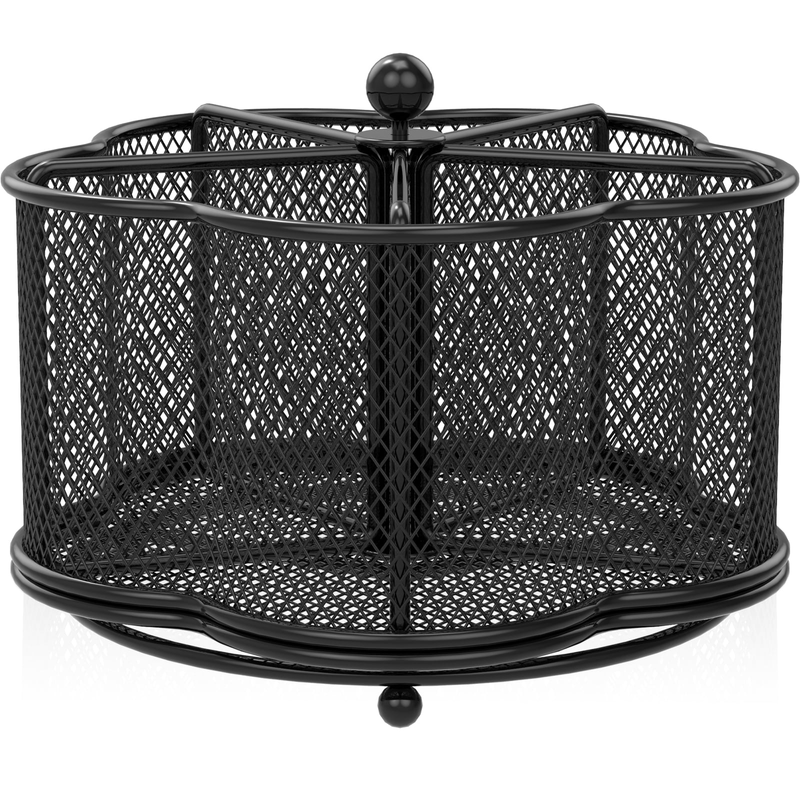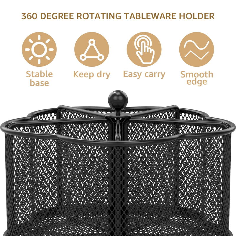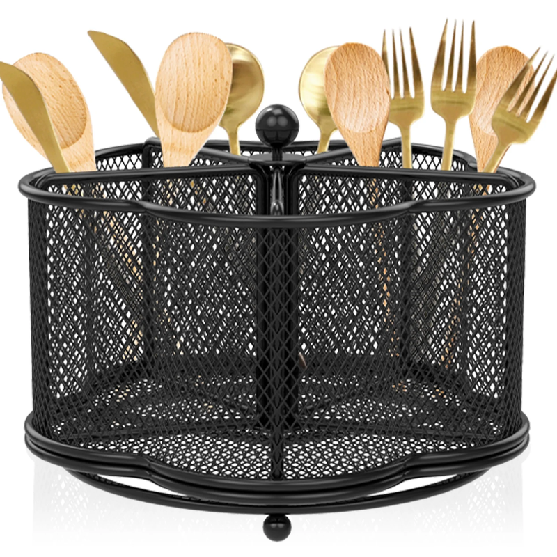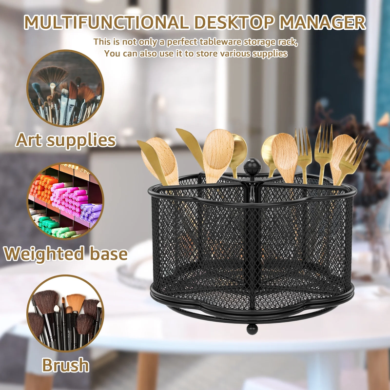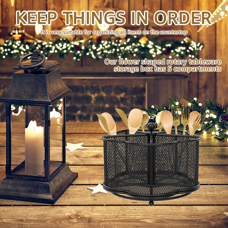 [Keep Your Cutlery in Order] Are you tired of the messy cutlery in your kitchen? Now, it is time for a change. The flower-shaped rotatable metal cutlery holder has 5 compartments designed specifically for chopsticks, cutters, spoons, napkins, scissors, condiments, etc. It's optimal for tidying up everything on your countertop. [360 Rotation and Always Upright Utensil Holder] The utensil organizer is made of high-grade metal mesh and carefully placed drainage holes, which provides ample breathing space for your cutlery. The tabletop cutlery holder features 360-degree rotation feature and makes the metal cutlery organizer more user-friendly. Furthermore, this small utensil organizer has a weighted base, so it won't easily tip over. [Easy to Carry and A Good Helper for Party] The metal utensil caddy organizer measures 18.3 x 18.3 x 13 cm /7.2 x 7.2 x 5.1 inches, lightweight and portable. If you're taking cutlery and napkins to a gathering, the cutlery organizer is much better than having cutlery scattered all over the table and napkins flying around. Also, its rotating design makes it easy for people to pick up cutlery from the organizer. [User-Friendly and Easy Clean] The countertop utensil caddy organizer has a smooth-surface that won't scratch your fingers and no assembly required. And, it is suitable for camping, party, buffet, picnic, bar, barbecue, RV or kitchen cutlery arrangement and storage. Moreover, when it gets dirty, it can be easily wiped clean with a wet towel and air dry. [Versatile Desktop Organizer] The cutlery storage holder is not just a cutlery storage rack; you could also use it for storing various items like pens, pencils, markers, clips, scissors, art supplies, remote controls, makeup brushes, paintbrushes, eyebrow pencils, lipsticks, and more.