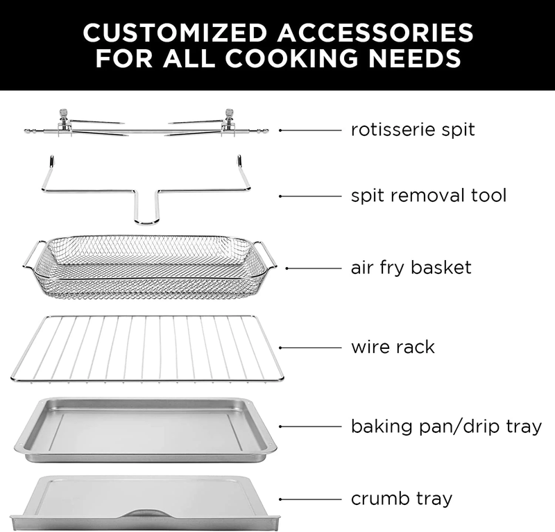 AIR FRY LIKE NEVER BEFORE: The world?s fastest, healthiest, and most convenient way to air fry has made its way to your countertop. Get dinner on the table faster than ever with easy access to delicious dishes through durable double French doors and cool-touch handles. Watch your favorite comfort foods cook to crispy, healthy perfection with wide windows and an illuminating interior light. AN ALL-IN-ONE EXPERIENCE: Master every single meal with the Chefman Extra Large Air Fryer and Convection Oven with French Doors. No matter what dish you?re in the mood for, you can air fry, broil, toast, rotisserie, bake, and keep warm from 200F to 450F with incredibly smooth dial control. COOK FOR A CROWD: Your search for the perfect family-size air fryer has come to an end. Let this oven be your go-to gadget for your partner?s, kids?, or roommates? favorite grub. Prep a 12-inch supreme pizza or toast up to 6 slices of your favorite breakfast bread all at once. It gets even better?simply wipe down the oven with a damp cloth and load the wire rack, basket, and rotisserie spit in the dishwasher for cleanup in a breeze. ACCESSORIES FOR EVERY TASK: You can now take on any cooking task with absolute confidence. Air fry tasty chicken tenders in the included basket, cook a whole chicken on the rotisserie spit, bake your world-famous banana bread on the pan, or whip up French fries to a golden finish on the wire rack. 120 Volts/1700 Watts RJ50-FDAF-M25 NEW