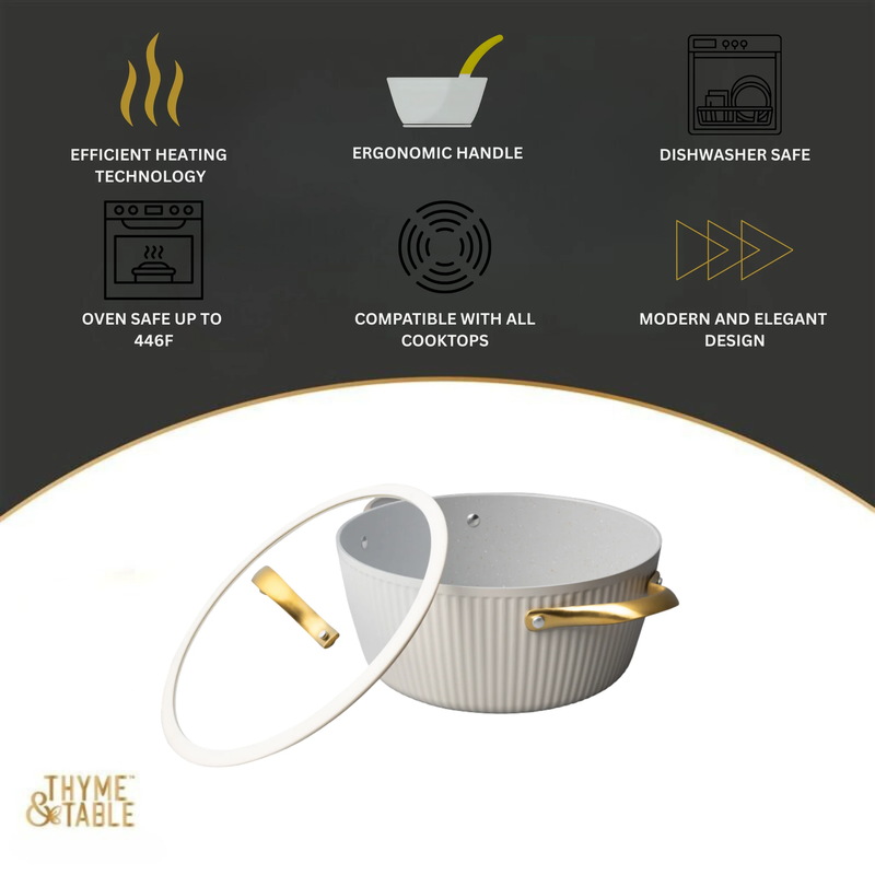 Ultimate Engineering: This Dutch oven is crafted to perfection using heavy gauged aluminum, ensuring exceptional results with every dish. Because of its stainless-steel induction base our cookware is engineered for all cooktops, including gas, electric or induction, and oven safe up to 446 Fahrenheit. Healthier Cooking and Non-Stick: The ultimate feature is its water-based, abrasion-resistant ceramic non-stick coating, promoting healthier cooking and effortless cleanup. Ultimate Handling: Designed for ease and precision, our cookware features ergonomic riveted handles that provide superior grip and balance, ensuring safe and effortless cooking in the kitchen. Revolutionize your Kitchen: Capable of handling everything from simmering, braising, and boiling, this Dutch Oven is designed to revolutionize your cooking experience. Offering versatility and durability in one stylish package, it elevates your kitchen setup. Enhance your culinary creativity with confidence using the Thyme Table 5.5QT Ceramic Non-Stick Ribbed Dutch Oven, White Gold. Recommended Cleaning: Dishwasher Safe