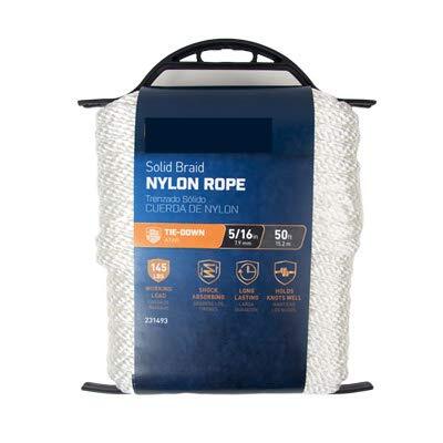 Product description: This Solid Braided Nylon Rope is provided on an easy to use reel convenient for storage. Best used for absorbing shock loads, such as towing, because it has an elasticity characteristic that will absorb the shock and return the rope very close to its original length after being stretched. Solid braided rope strands all travel in the same direction, clockwise or counter clockwise, and alternate between forming the outside and inside of the rope. Size: 5/16" x 50' Color: White Safety work load: 145 lbs Provided on an easy to use reel convenient for storage Solid braided rope strands all travel in the same direction, clockwise or counter clockwise, and alternate between forming the outside and inside of the rope Comes on a winder.