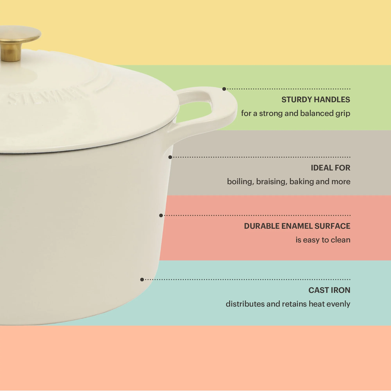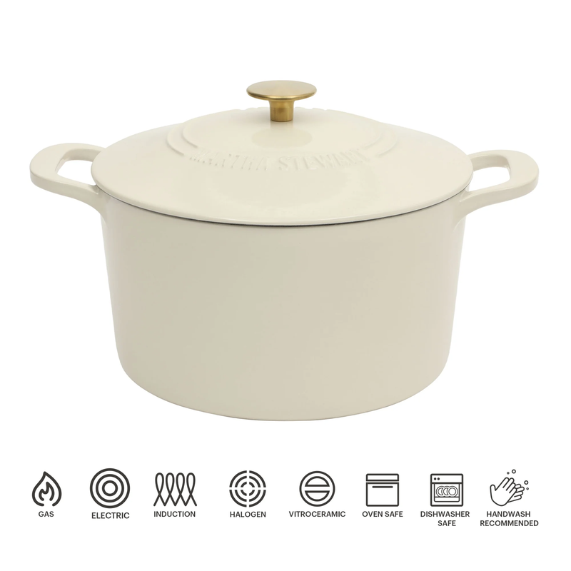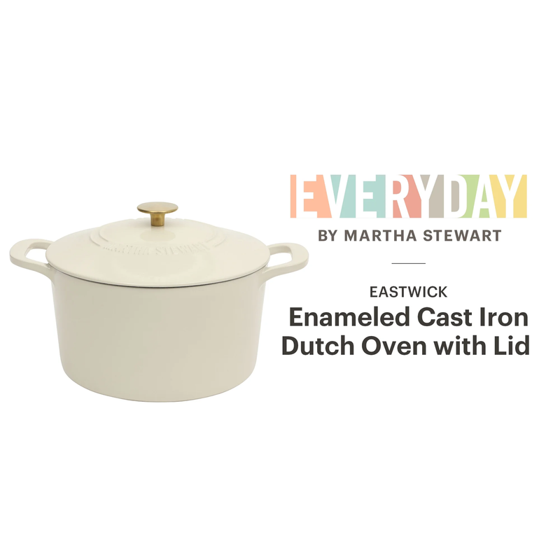 With so many tasks to do while preparing and cooking in the kitchen, every home cook needs a tough companion that can do it all with flying colors. The Everyday by Martha Stewart Eastwick 7-quart Enameled Cast Iron Dutch Oven is a well-loved kitchen darling that gets the job done. Crafted from durable cast iron, this heavy-duty pot distributes and retains heat evenly to ensure no-hotspot results, locking in flavors and moisture for truly delicious meals every time. It offers versatility to do a variety of cooking styles such as slow-cooking, braising, boiling, even baking artisanal sourdoughs or country-style corn breads! From hearty soups to tender roasts, this Dutch oven brings style and professional-quality performance into your home kitchen. The glossy enamel finish offers a stain-resistant coating that is easy to clean and pretty to look at for elegant presentations on your countertop or table. Its vibrant color and classic design make it a piece you?ll be proud to serve in. Sturdy handles offer balance and support for easy handling and transfer, even when the pot is full. The lid has raised dots underneath to redirect moisture back onto the food to simulate a self-basting cooking environment to enhance natural flavors and deliver fall-off-the bone results with minimal effort. Suitable for use on induction, gas, electric, halogen, ceramic, and glass stovetops, this Dutch oven is perfect for preparing cherished family recipes that evoke familiar memories through taste, as well as creating exciting new dishes for guests with more adventurous palates. Oven safe up to 500F. Hand wash only. Enjoy beautifully crafted kitchen and tabletop pieces that blend style and function with Everyday by Martha Stewart. Inspired by Martha's love for elevated dining and entertaining, these products are crafted for the everyday home cook who shares her passion for home-cooked meals, entertaining guests, and sharing moments with family and friends.