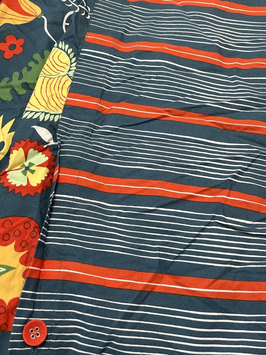 Good condition with normal light wear from laundering and storage. No holes or stains noticed. Buttons intact. Colors remain vibrant.