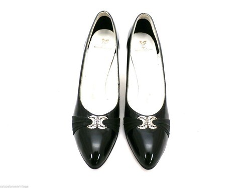 Womens vintage 1950s shoes, from Martinique, Franklin Simon. These were never worn! The patent leather is as shiny as the day they were born, and they have pretty satin pleated ribbons with silver filigree and rhinestone accents on the upper. They have leather soles, and you can tell these were expensive when new.