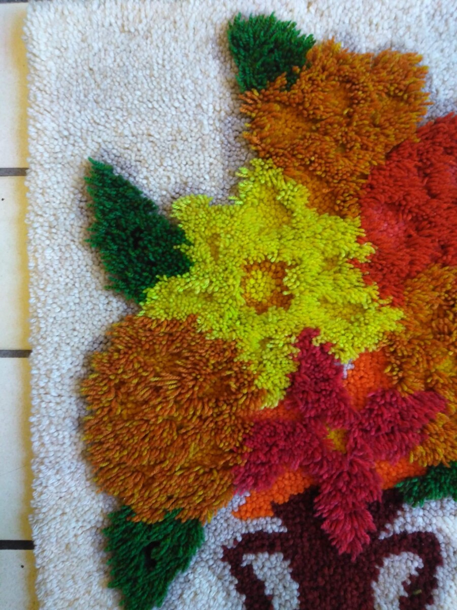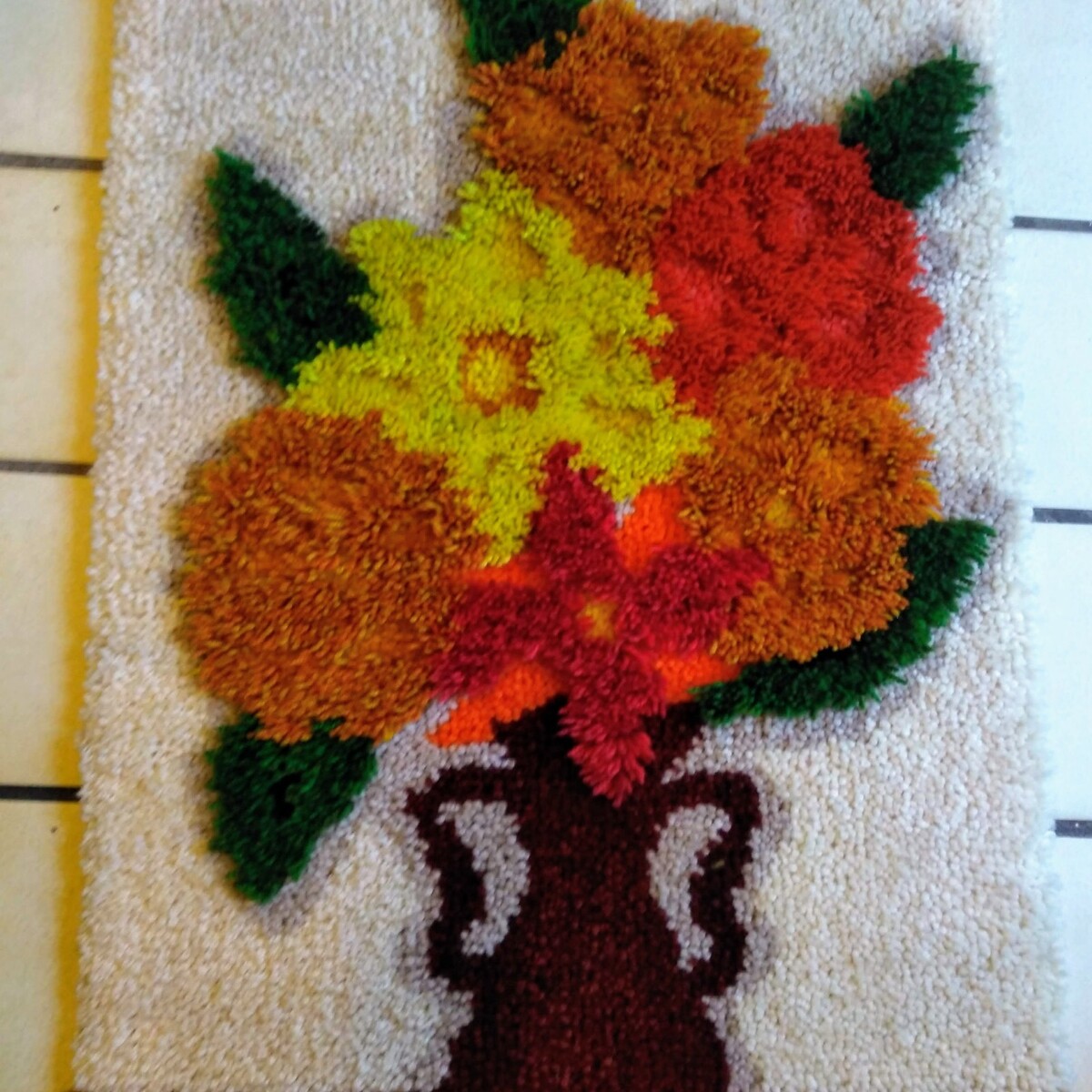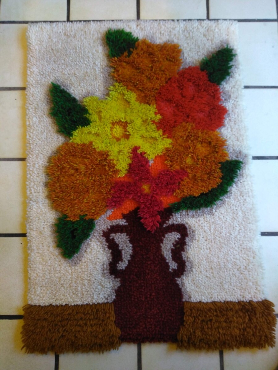 Bright mid century style shag latch-hook featuring bold orange, yellow, red, and green florals in a classic vase. Handmade with great texture and color. Beautiful as wall art for a boho, eclectic, or retro room.