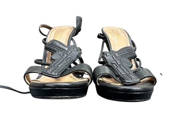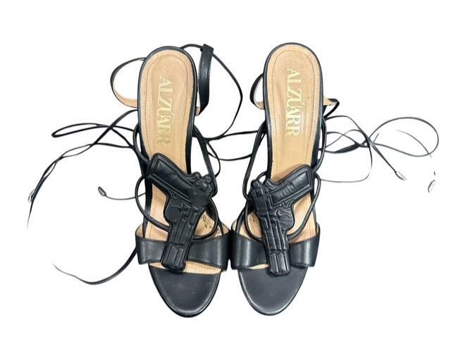 ALZUARR Gigi Black Statement Guns / Pistols Leather Sandals Heel Shoes Size 40 IT / 10 US Retails $324.99 Made in Italy Previously owned and unfortunately were not properly cherished as we can see from the wear especially on the bottom soles and heels Please note the first 2 pictures are stock photos Comes as shown