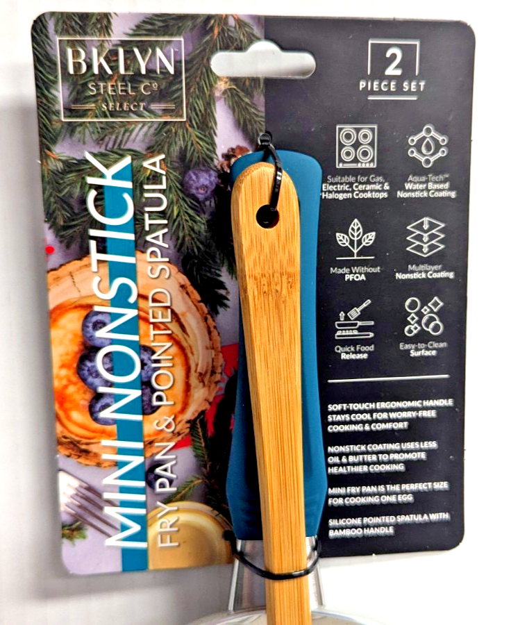 The BKLYN Steel Mini Non-Stick Fry Pan and Pointed Spatula set is a stylish and practical addition to any kitchen.