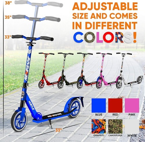 ADJUSTABLE HEIGHT: Our big kid scooter boasts a T-bar handlebar adjustable to three heights: 33", 36.2", and 39". It's equipped with a durable anodized clamp collar for added strength.