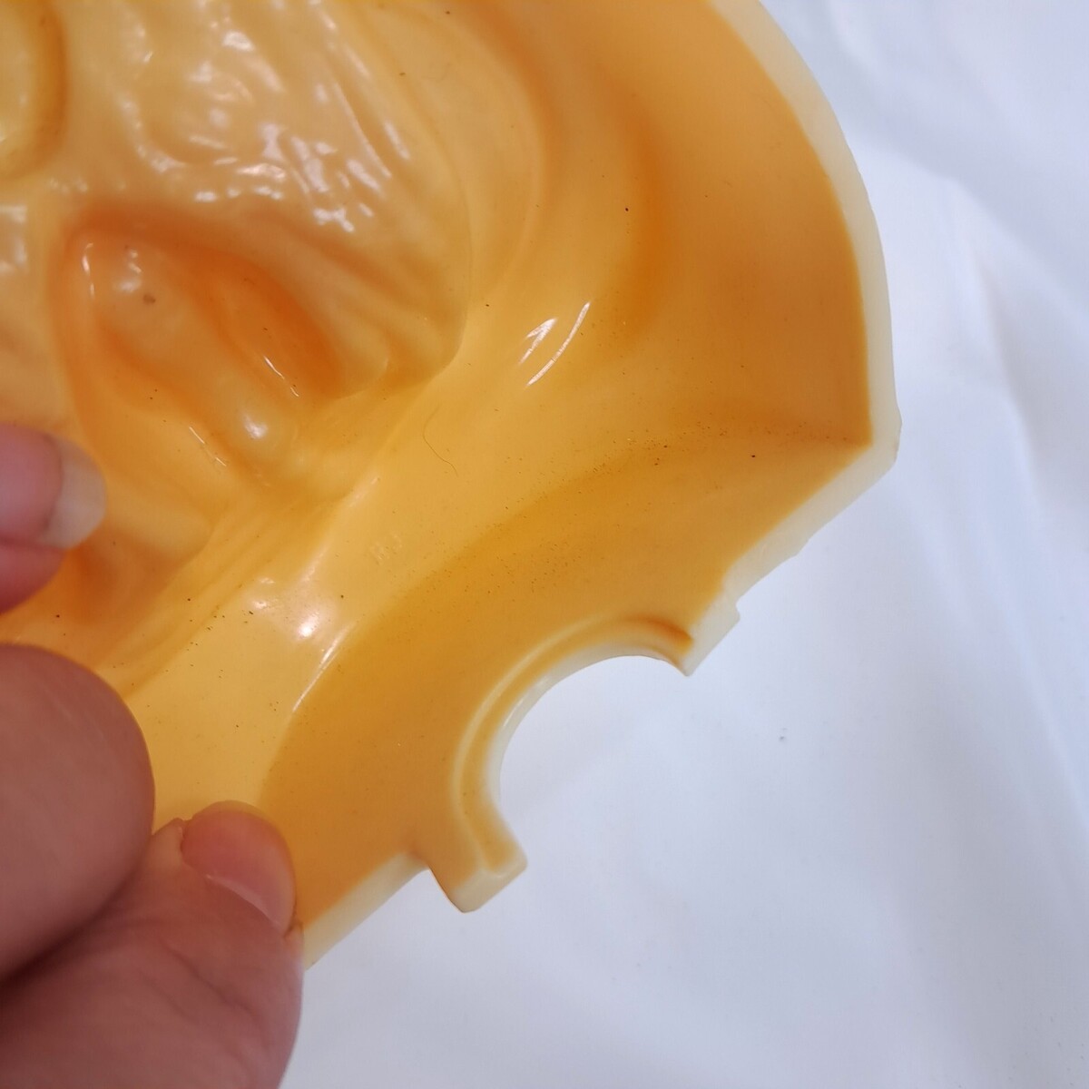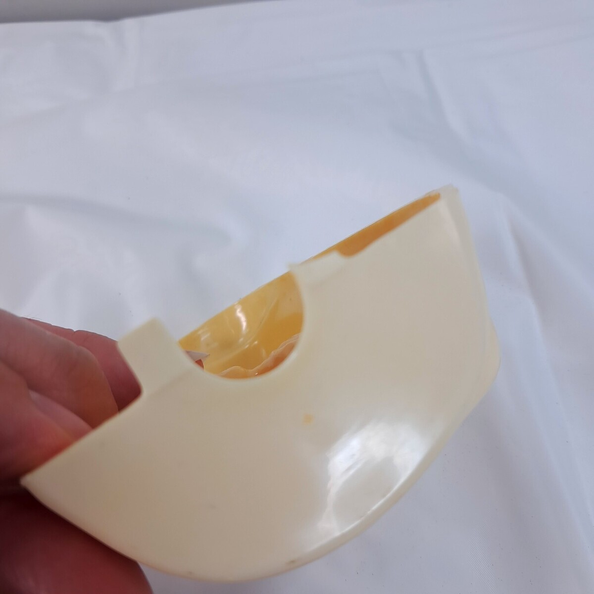 Cream colored plastic. Some yellowing as shown to he night light portion. One of the clips for the cover is broken, as shown, but stays on as it should. Includes bulb.