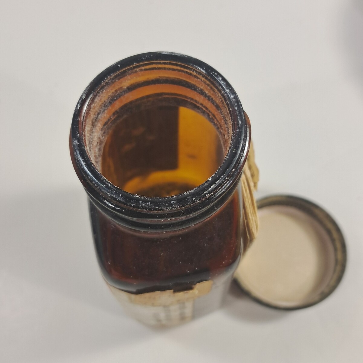EMPTY glass brown/amber bottle Paper on bottle has tearing/wear as shown. Metal black lid. See pics for condition.