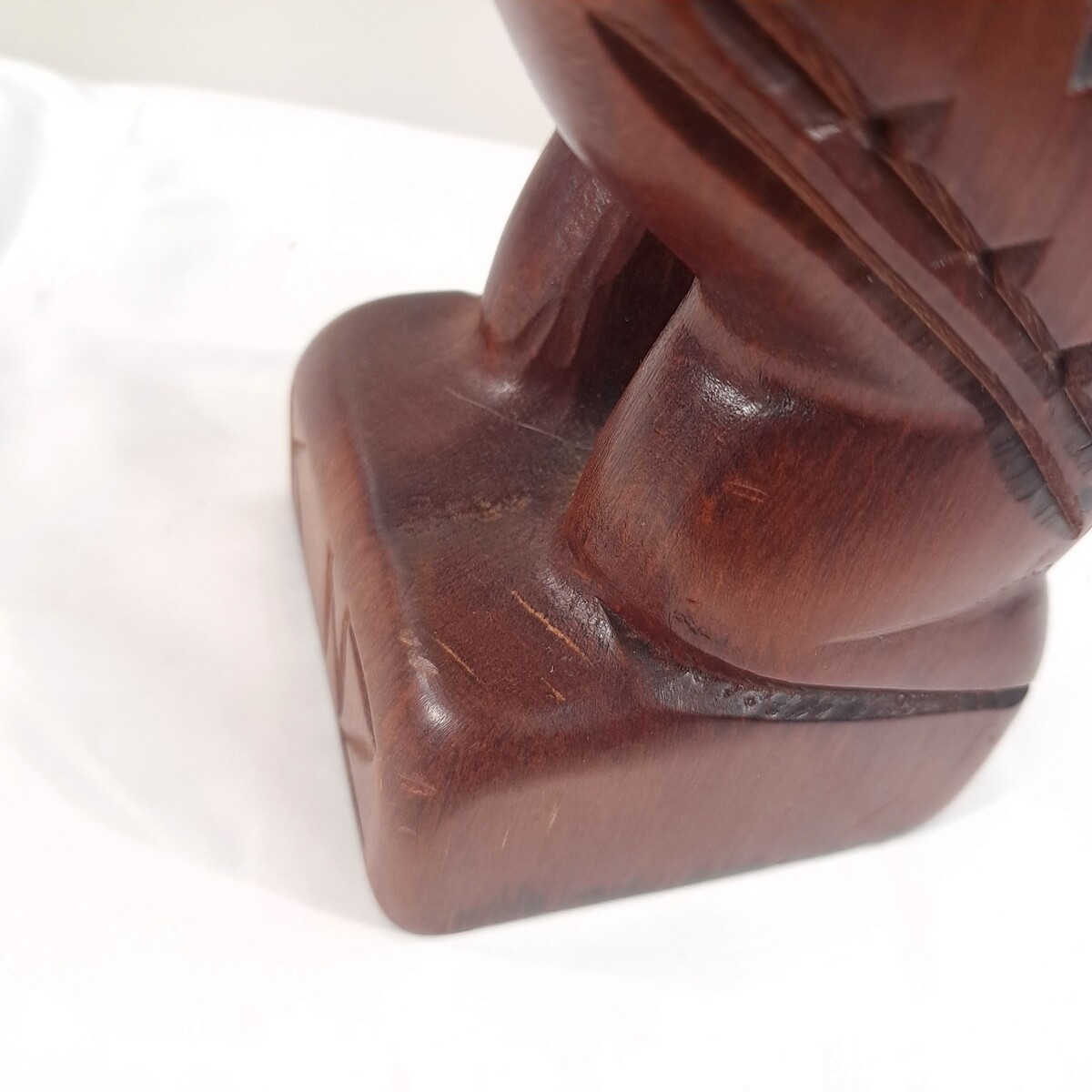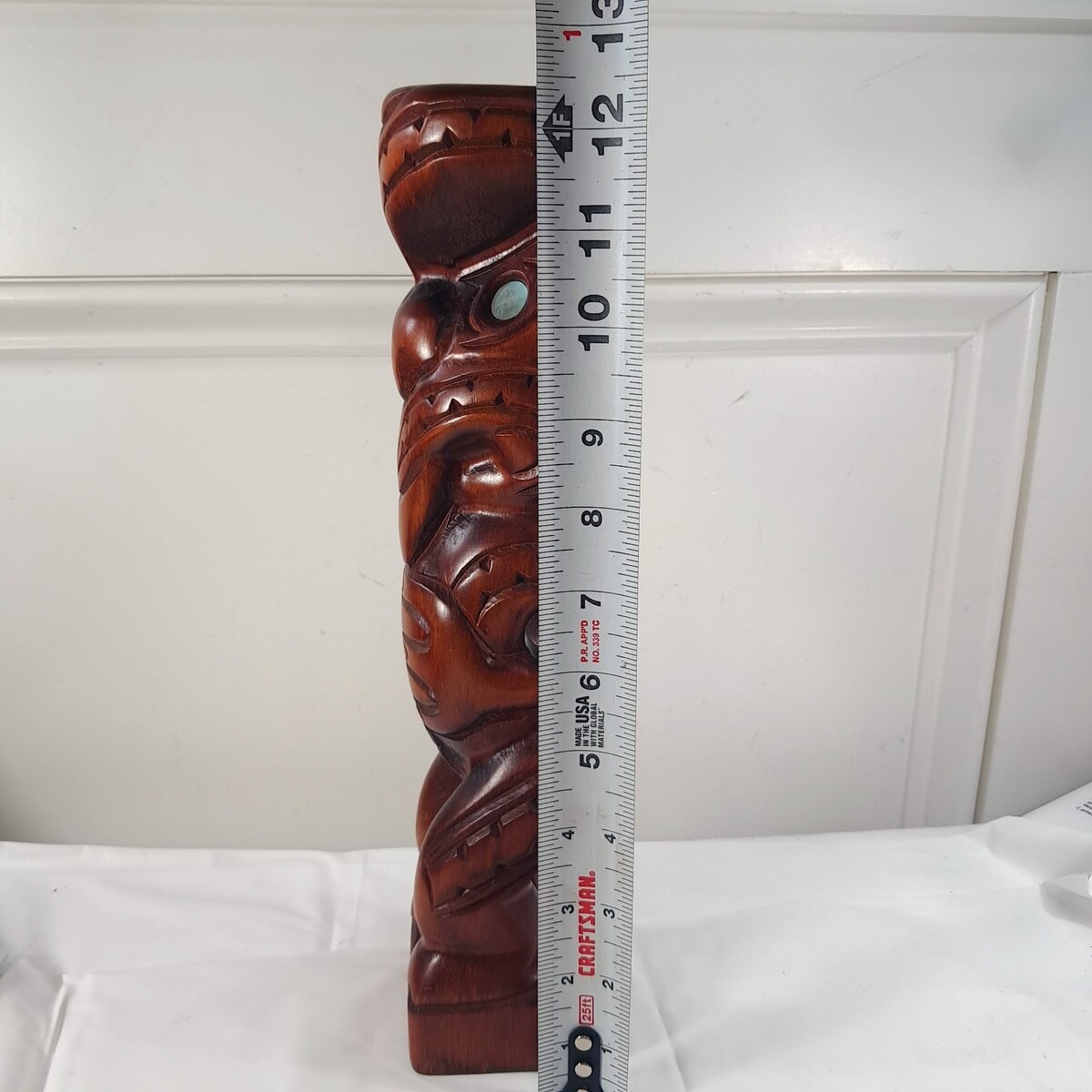 Mother of pearl eyes and hand carved wood. Some minor scratches/scuffs as shown. See pics for measurements.