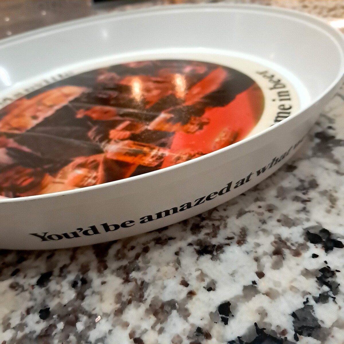 Plastic tray made by Thermo-Serv. Image on the top is bubbled/worn as shown. Some marks as shown. Fair condition. See pics for size and condition.