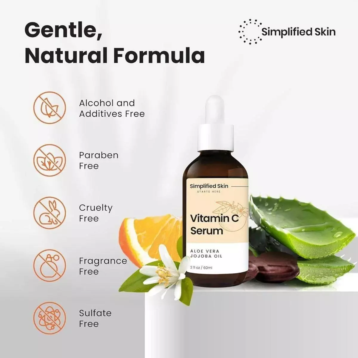 The Simplified Skin Vitamin C Face Serum is a 98% natural and 72% organic formula designed to visibly improve skin tone, texture, and radiance. With a potent 20% Vitamin C concentration and skin-loving ingredients like plant-based Hyaluronic Acid, Organic Jojoba Oil, Aloe Vera, Vitamin E, and Witch Hazel, this serum delivers powerful antioxidant protection while deeply hydrating and firming your skin.this lightweight, fast-absorbing serum is suitable for all skin types and genders—making it a daily essential for anyone looking to reduce signs of ageing and achieve smoother, brighter, more even-toned skin