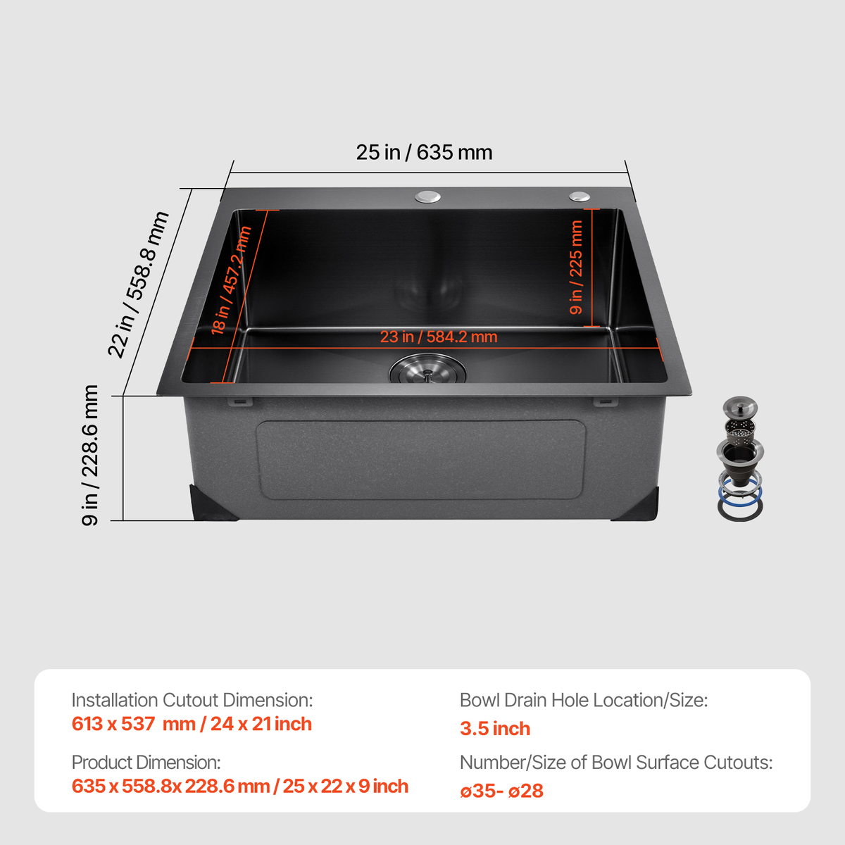 Large Capacity: Sink External Dimension: 25x22 inch. Internal Dimension: 24x21 inch. Bowl depth: 9 inch. This kitchen drop-in basin is deep enough to accommodate cups, pots, and baking trays, meeting various washing needs.