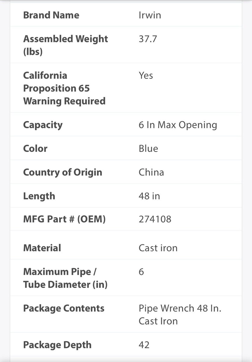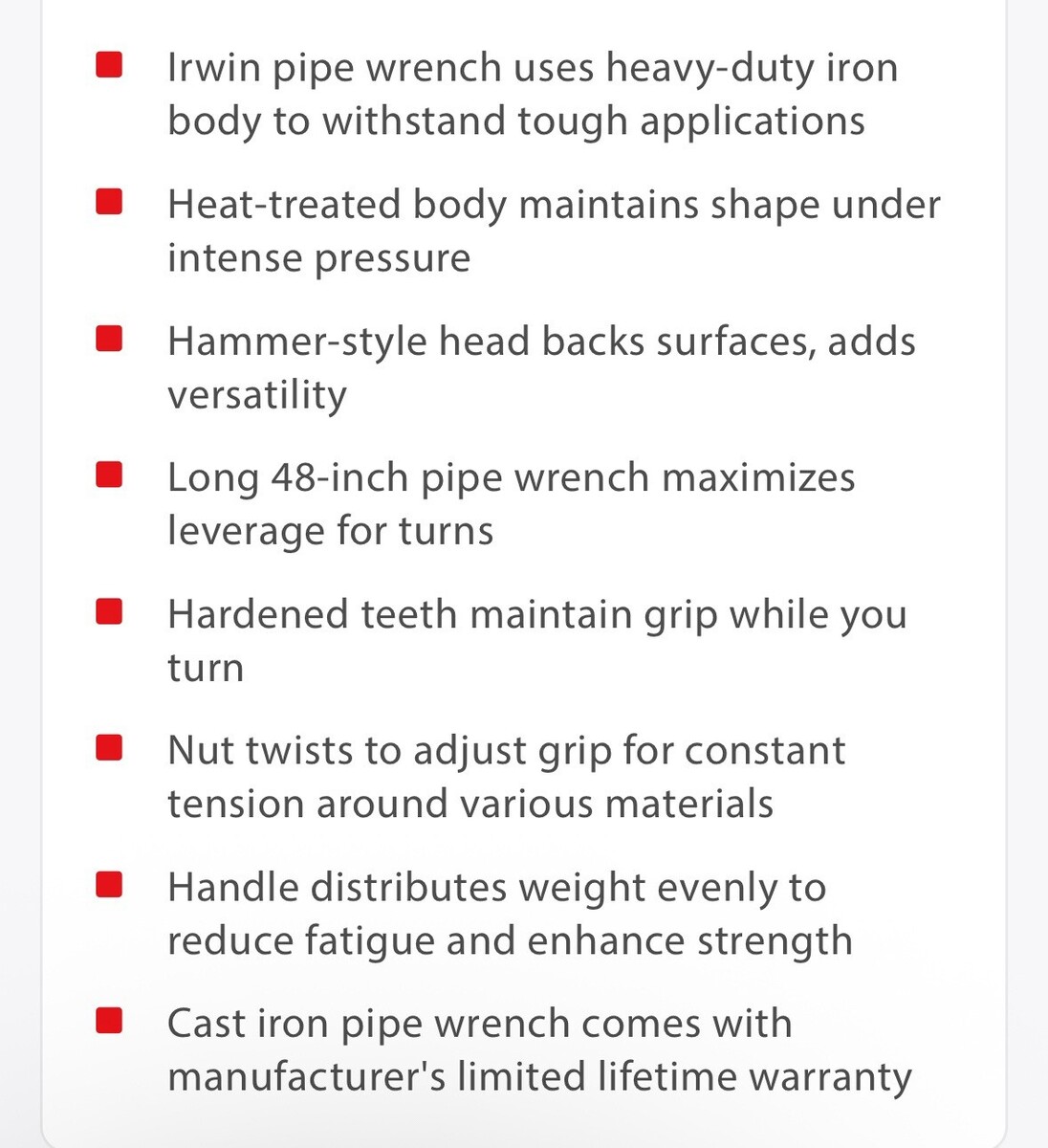 Irwin Vise Grip 274108 48-inch HD Cast Iron Pipe Wrench 6” Max Diameter