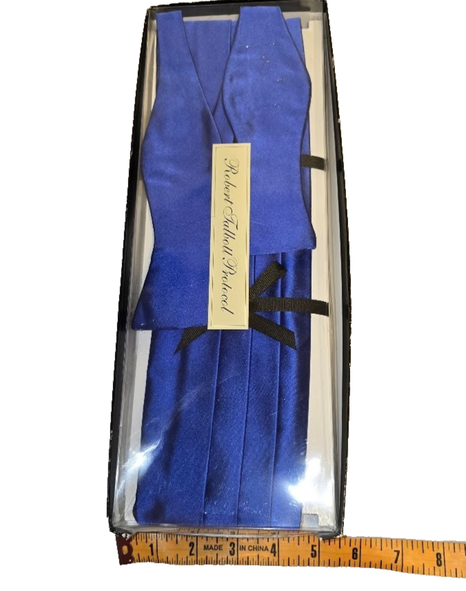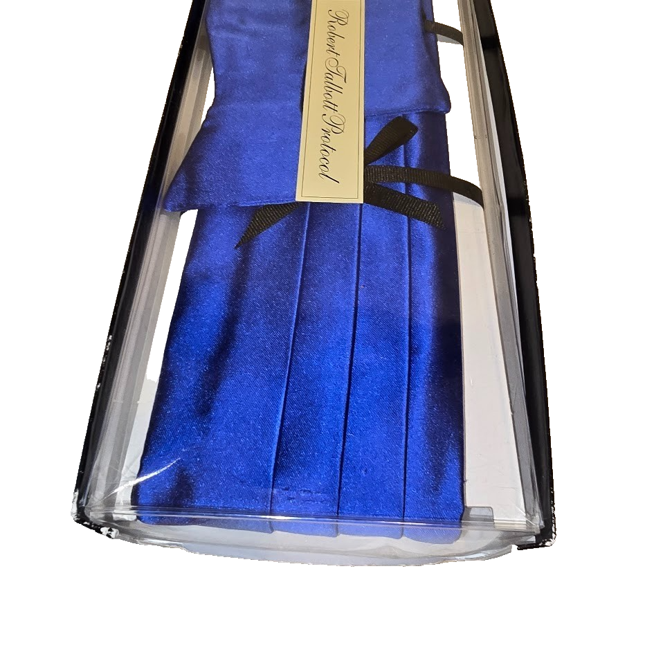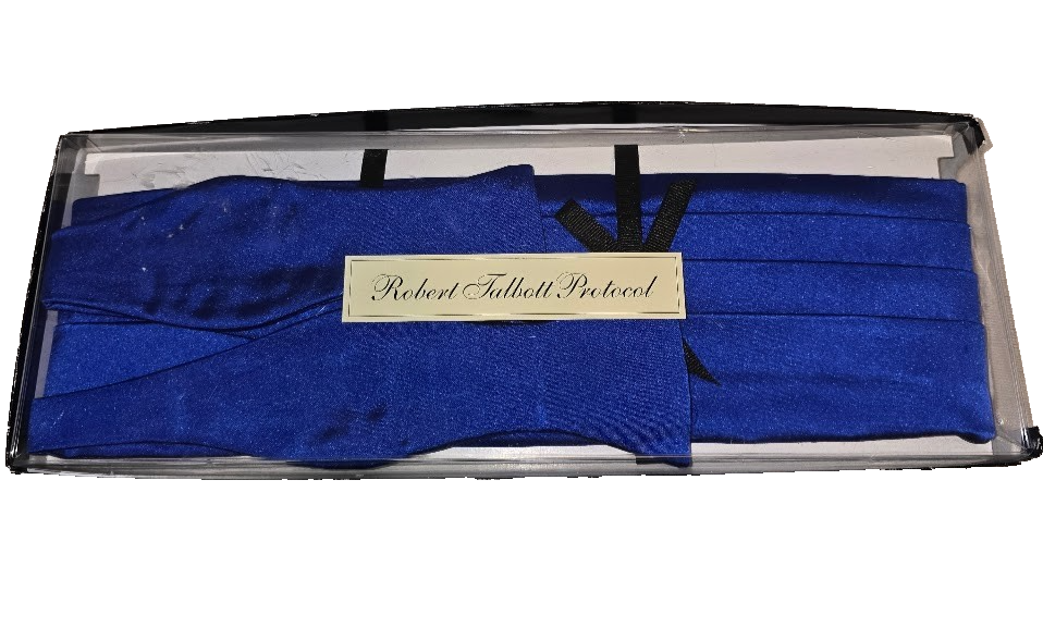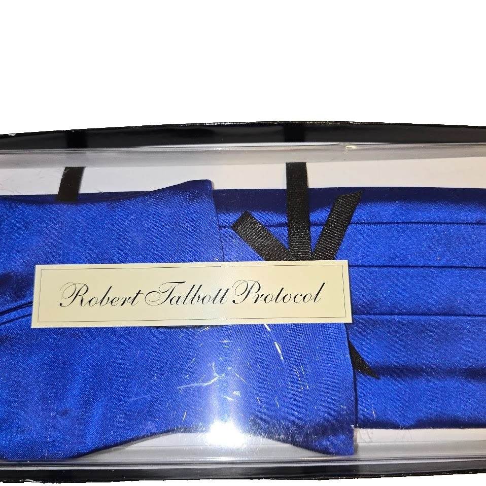 Add a bold splash of royal-blue elegance to your black-tie ensemble with this luxurious satin cummerbund and pre-tied bow-tie set from Robert Talbott?s prestigious ?Protocol? collection. The vibrant blue satin catches the light with a rich sheen, delivering classic sophistication while standing out from a sea of basic black.