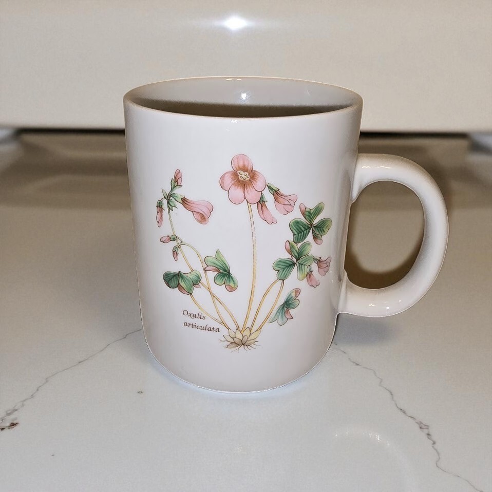 Celebrate your botanical style with this vintage BIA Cordon Bleu coffee mug showcasing delicate Oxalis articulata blooms. The sturdy cream white ceramic and graceful handle add instant cottagecore charm to your daily brew.