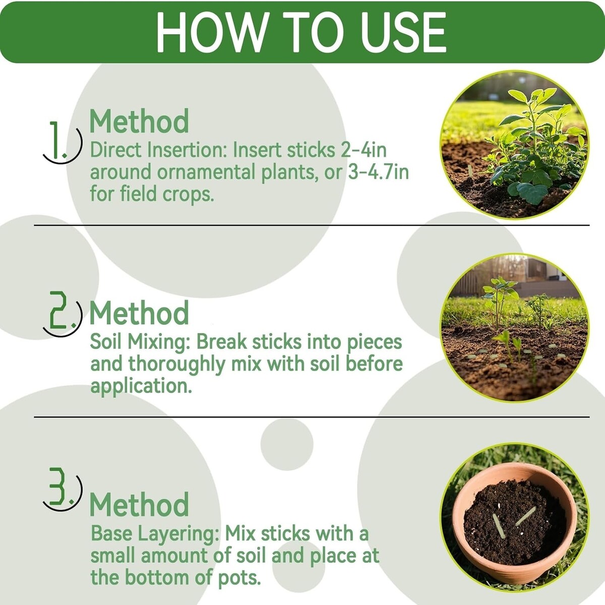 Simply insert the spikes 2-4 inches (5-10 cm) around the base of each plant, ensuring full submersion in soil. For larger field crops, position 3-5 inches (8-12 cm) deep. No complicated procedures necessary!