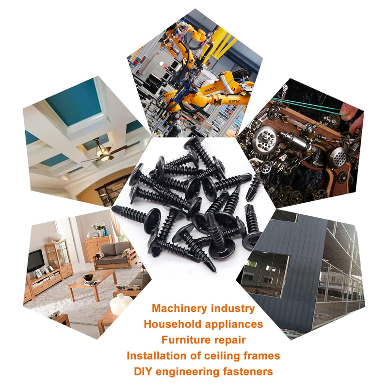 Application: These self-tapping screws are perfect for a wide range of materials, including wood, plastic, and softer metals. They are particularly effective for connecting color steel plates, wall beams, and more. Their versatility makes them suitable for use in the machinery industry, household appliances, furniture repairs, ceiling frame installations, and DIY engineering projects.