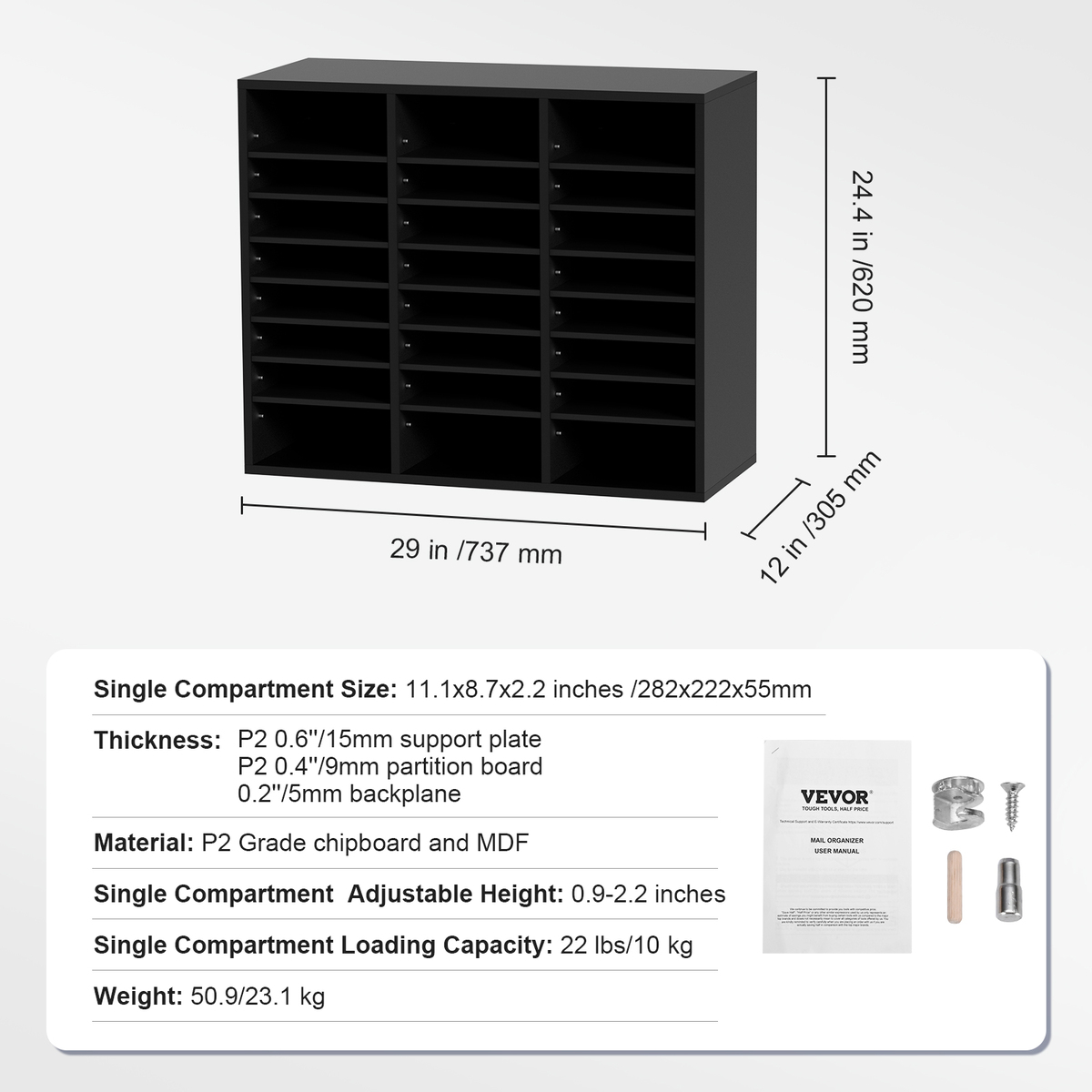 Maximize Your Space: Say goodbye to cluttered desktops with VEVOR 29''x12''x24.4'' wood literature organizer. It has 24 compartments in total, arranged in 8 rows and 3 columns. You'll have ample space to store and organize books, documents, magazines, papers, and other materials. Keep your workspace neat and tidy with ease.