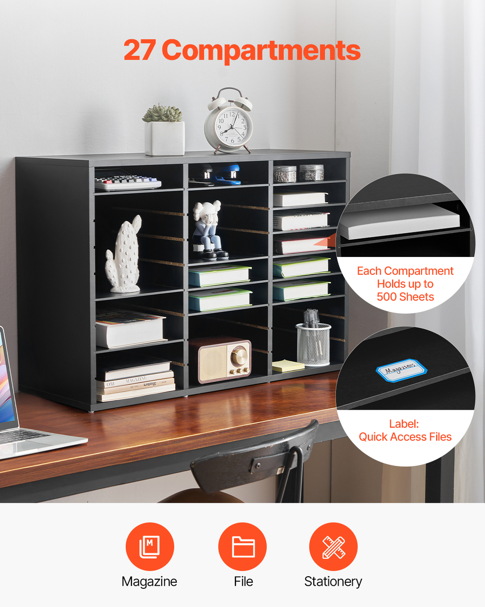 27-Compartment Large Capacity: Say goodbye to a cluttered desk with our literature organizer. Featuring 27 roomy compartments arranged in 3 columns and 9 rows, you'll have plenty of space to neatly store books, documents, magazines, and more. Plus, the included labels make it easy to find your files quickly without wasting precious time.