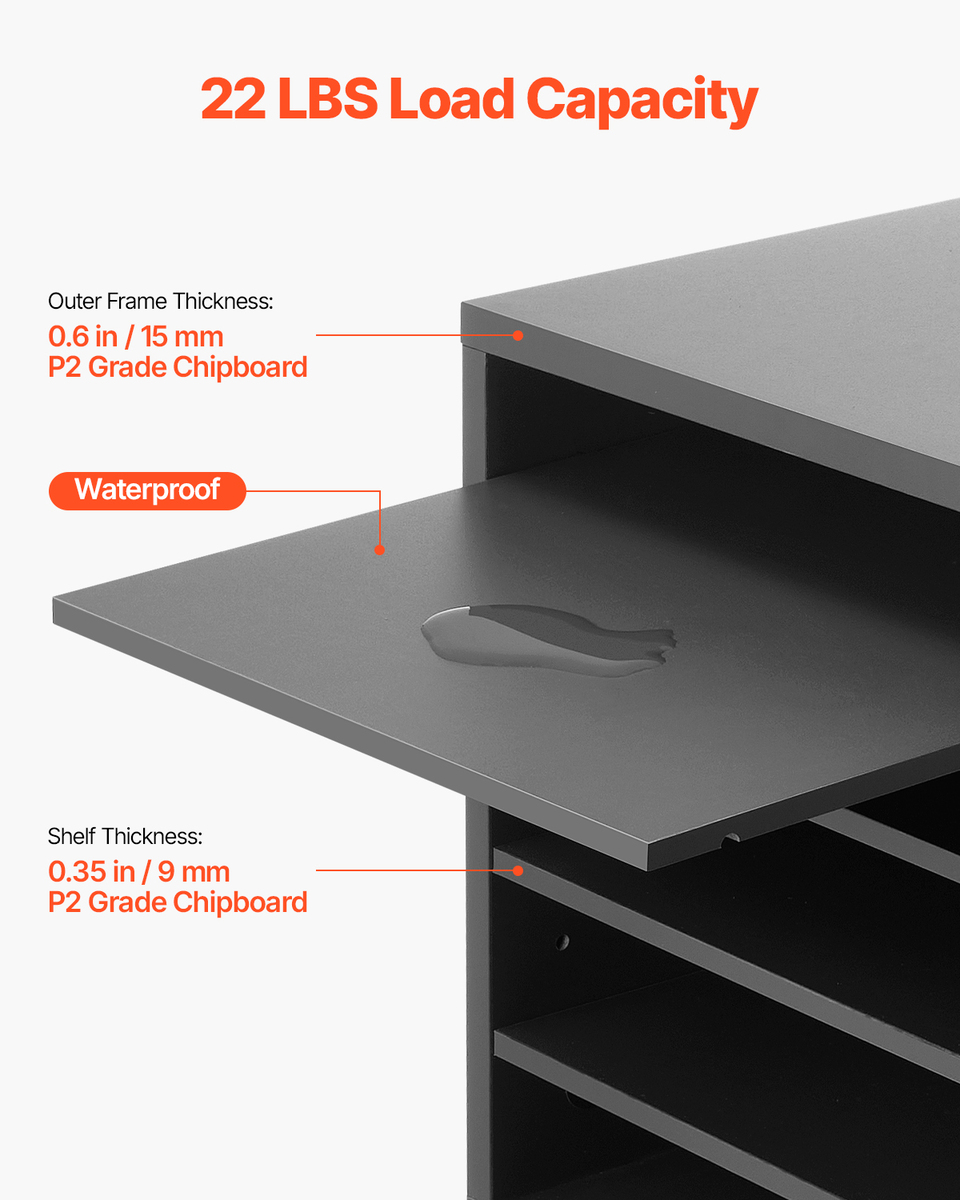 Built to Last: Our wood literature organizer is made from sturdy P2 particle board and MDF, each shelf holding up to 22 lbs / 10 kg. Whether you're storing heavy files or everyday items, this organizer stands strong. Plus, it's EPA certified, so it's secure for you and your family. The smooth, polished surface is waterproof, scratch-resistant, and easy to wipe clean.