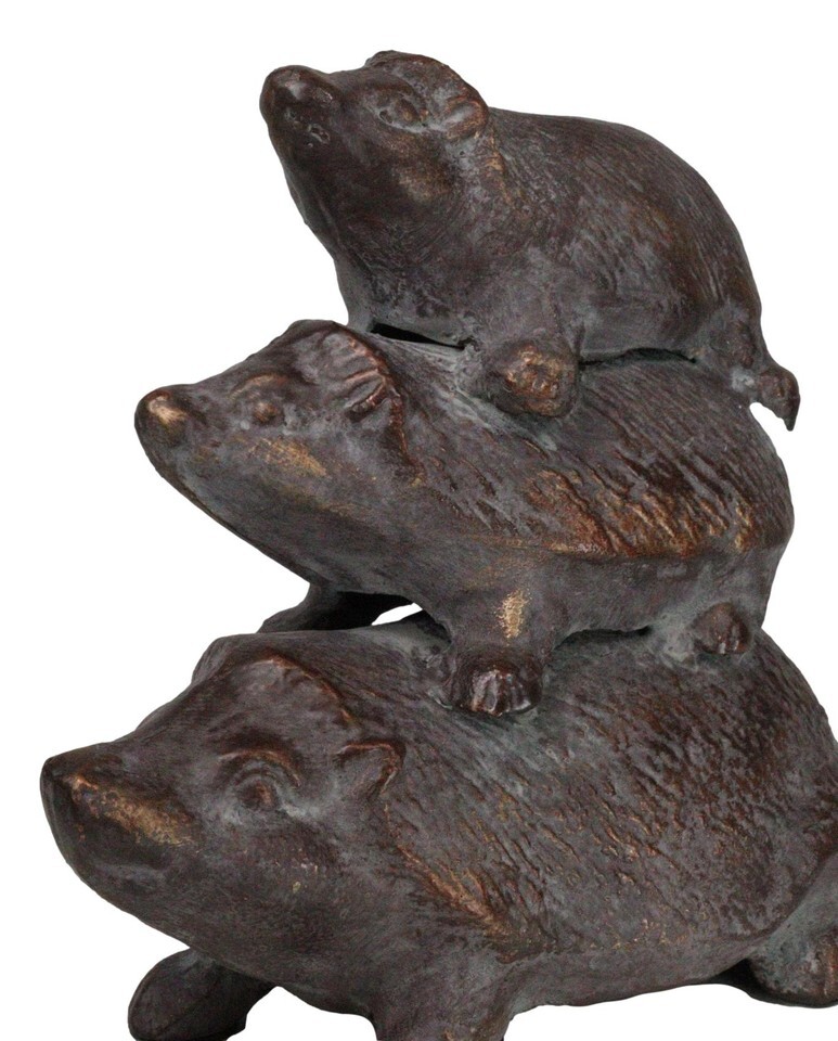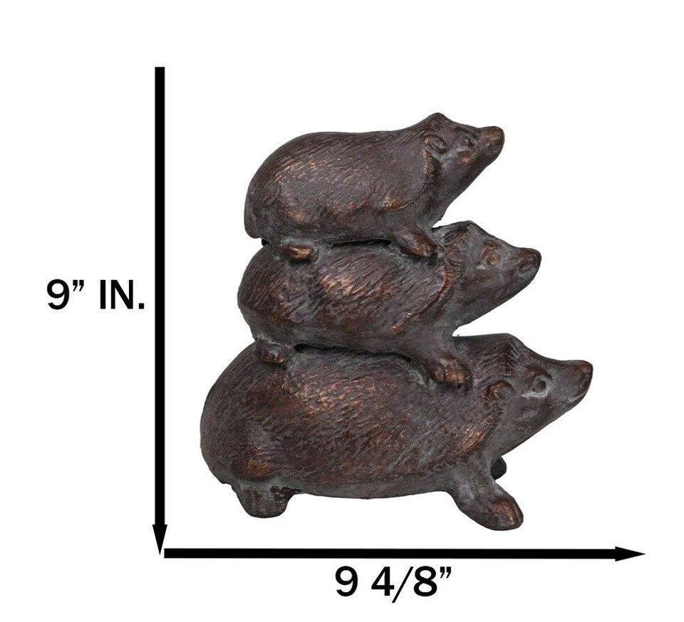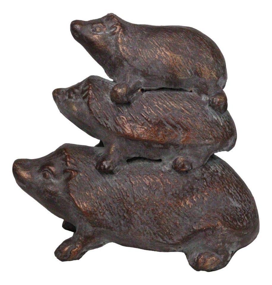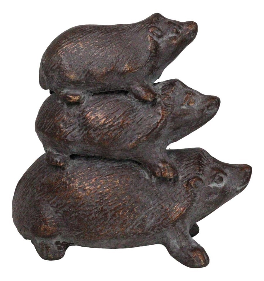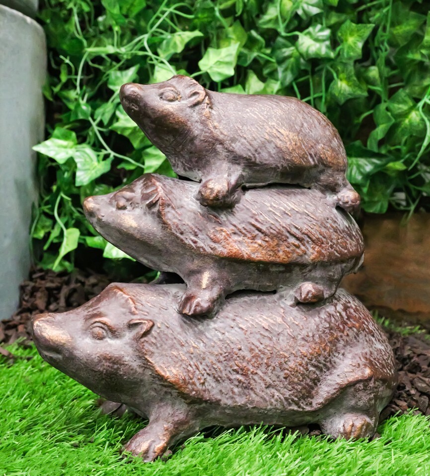 ? This Stacked Acrobatic Trio Hedgehog Statue is made of cast iron, hand painted and polished in vintage aged bronze finish. This high end garden sculpture is made using the lost wax, sand casting and hot patina techniques, done by hand.