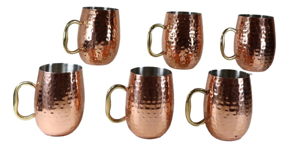 Pack Of 6 Moscow Mule Copper Stainless Steel Hammered Barrel Cup Mug Gold Handle