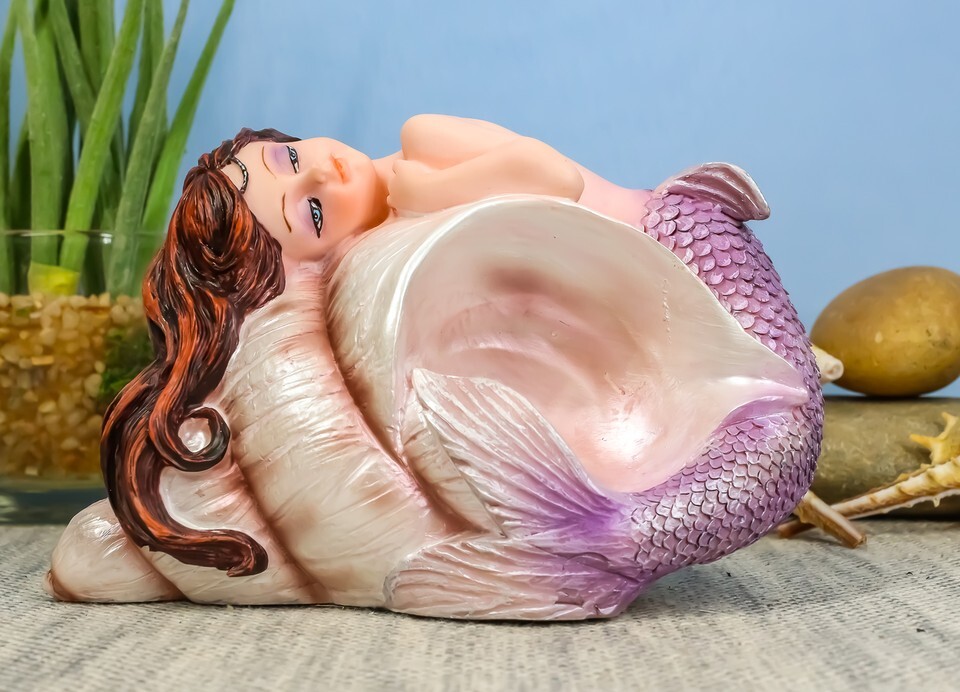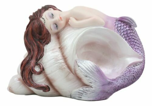 ? If you are a big mermaid fan or know someone who loves mermaids, you will love this figurine! It features a beautiful young mermaid with a unique purple tail sleeping on a giant ocean sconce.