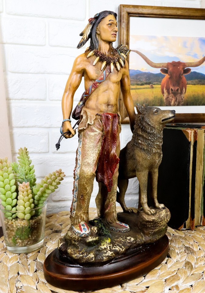 Southwestern Tribal Indian Warrior Chief With Gray Wolf Collectible Figurine