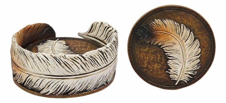 ? This Southwestern Indian Eagle Feather Sculpted Coaster Set is made of high quality water resistant polyresin, individually hand crafted and painted. Color tone may vary from picture. The Mug and props in the photos are not included with this listing.