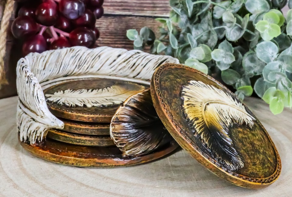 Ebros Rustic Western Indian Eagle Feather Coaster Holder with 4 Round Coasters