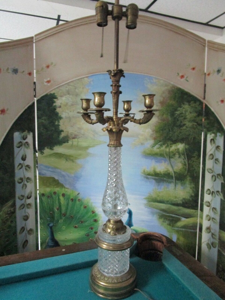 FOUR ARMS TWO LIGHTS BRASS DEPRESSION GLASS DIAMOND DESIGN ELECTRICAL TABLE LAMP 40" OUTBACK