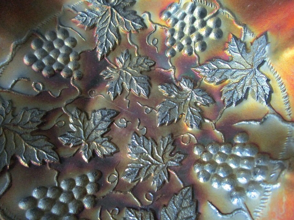 Northwood dark marigold carnival glass ruffled bowl Grapes & Cable