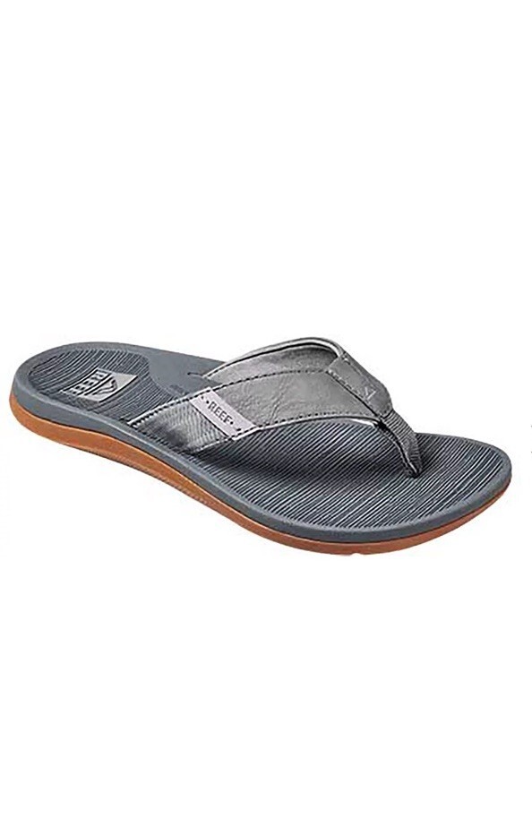 The Reef Men's Santa Ana Flip Flop Sandals in Cushion Gray offer ultimate comfort and style for the beach or pool. With a slip-on design and rubber outsole, these sandals provide arch support and are perfect for travel, activewear, or casual occasions. The synthetic lining and upper material ensure durability, while the blue accents give a fun and stylish touch. Made by Reef, a trusted brand in resortwear, these sandals are a must-have for the summer season.