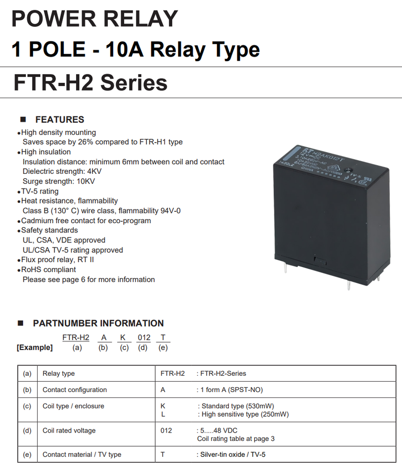 1 Unit of FTR-H2AK012T Fujitsu 1 Pole Power Relay 12V DC SPST-NO 10A TV-5
