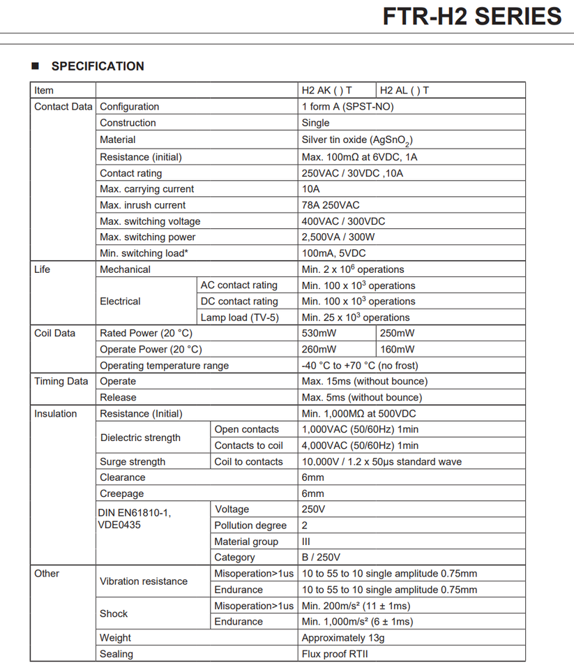 1X FTR-H2AK012T Fujitsu 1 Pole Power Relay 12V DC SPST-NO 10A TV-5