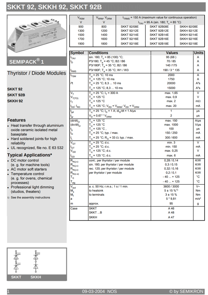 1 Piece - SKKT 92/16 E SEMIKRON Thyristor-Diode Module Dual SCR 1600V 95A Semipack 1
