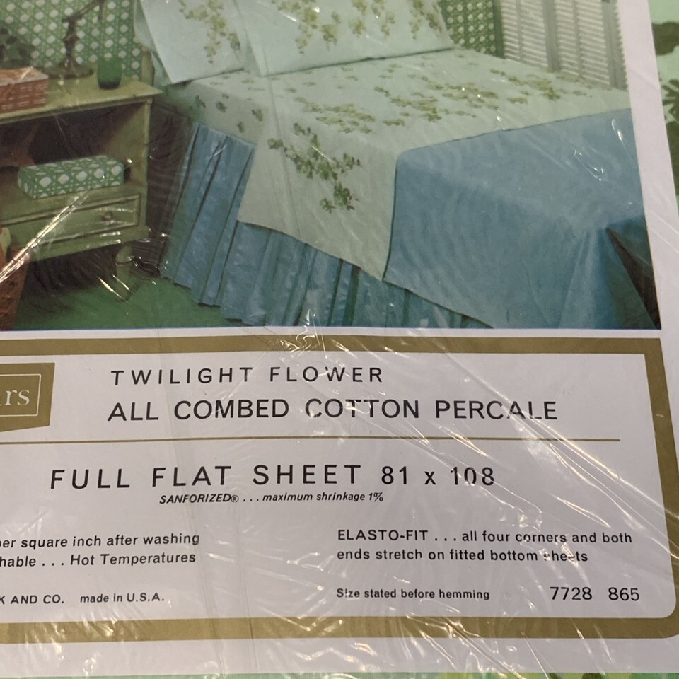 Vintage Sears Twilight Flower Green Full Size Flat Sheet Percale Perma-Prest NOS
