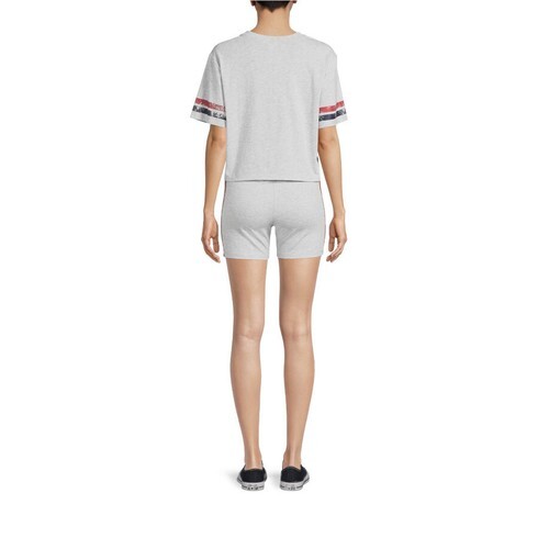 T-shirt features: Relaxed fit; pullover styling; front graphic and arm band stripes; cropped length; ribbed neckband