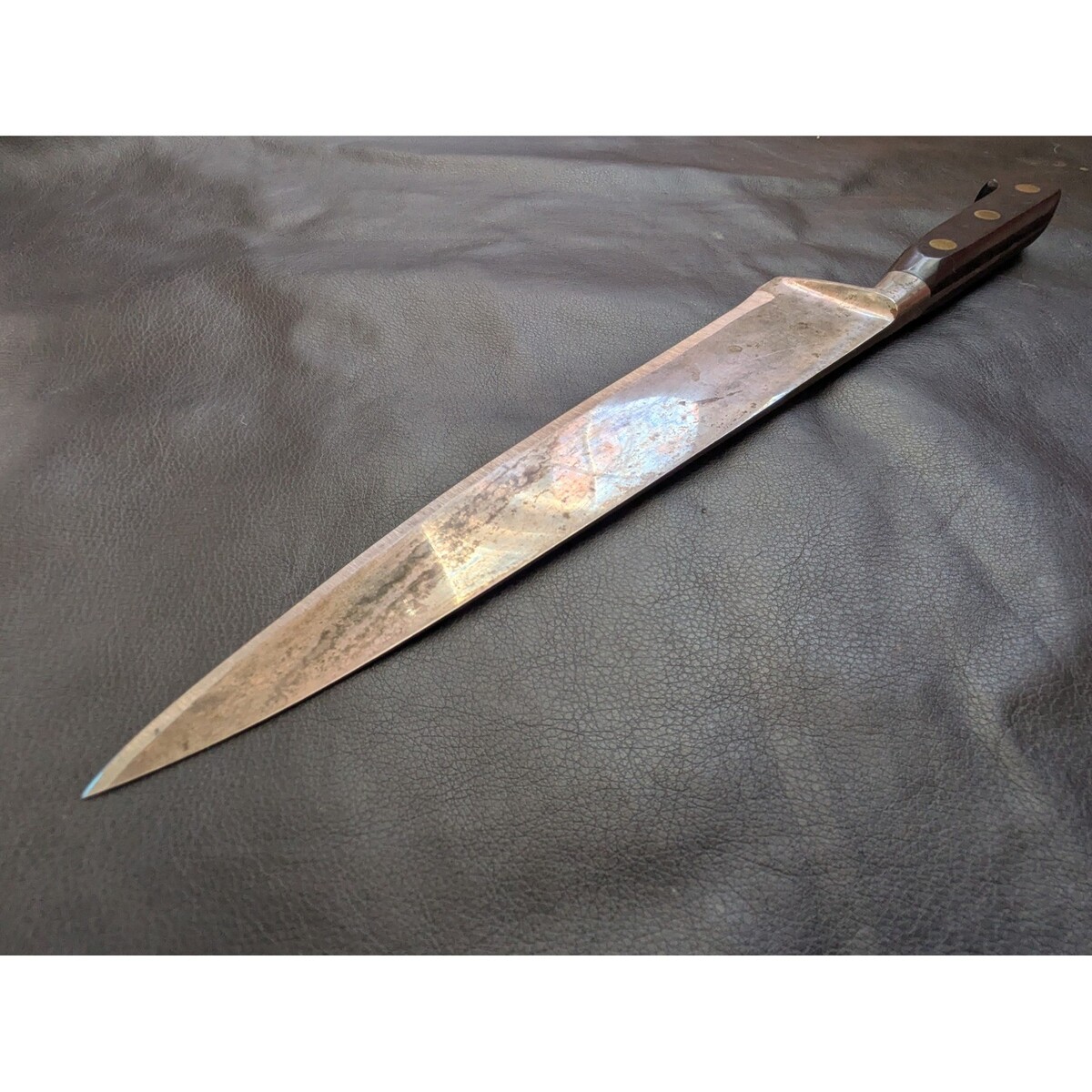 Possedez un morceau d'histoire culinaire avec ce couteau de chef professionnel Sabatier. Ce couteau substantiel est dote d'une lame robuste de 10 pouces, prete a affronter toute tache de hachage, de tranchage ou de decoupage en des dans votre cuisine. La patine bien usee de la lame temoigne de ses nombreuses annees de service devoue, de sa fiabilite prometteuse et de son caractere unique. Sa poignee noire classique et confortable avec des rivets en laiton assure une prise sûre pour un controle precis. Ameliorez votre experience culinaire pour les repas de tous les jours, les creations gastronomiques ou meme comme piece maîtresse dans une cuisine professionnelle.