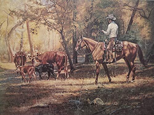 Product description: Riding the Herd is a signed and numbered limited edition print by Tim Cox. It depicts a cowboy herding cattle back to the ranch. The image size is 13" x 17 1/2". Overall size is 17 1/2" x 21 1/2". It was published by Texas Art Press in 1979 in a limited edition of 2,250. About the Artist: Endless nights of painting until dawn are finally paying off for Tim Cox. He is one of the best known western artists, having been voted into the U. S. Art Magazines Print Hall of Fame - 2000. Dozens of his Limited Edition Prints have sold out through the years - some as quickly as 3 weeks. Sales of his popular calendar line which started in 1986 have exceeded four million to date. One of the best compliments paid to his calendars is that you often see his tear off style calendars complete, late in the year. People will lift off the pages to find the date rather than tear them off! Tim's paintings have appeared on over 110 magazine covers through the years, and he has been featured in articles in at least 16 different publications, including Southwest Art, Western Horseman, Art of the West, American Cowboy and Beef.