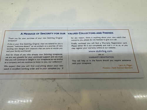The watch comes in its original box with a presentation case and booklet. Its two-piece leather strap adds to the overall aesthetic of the watch, which is designed for women.